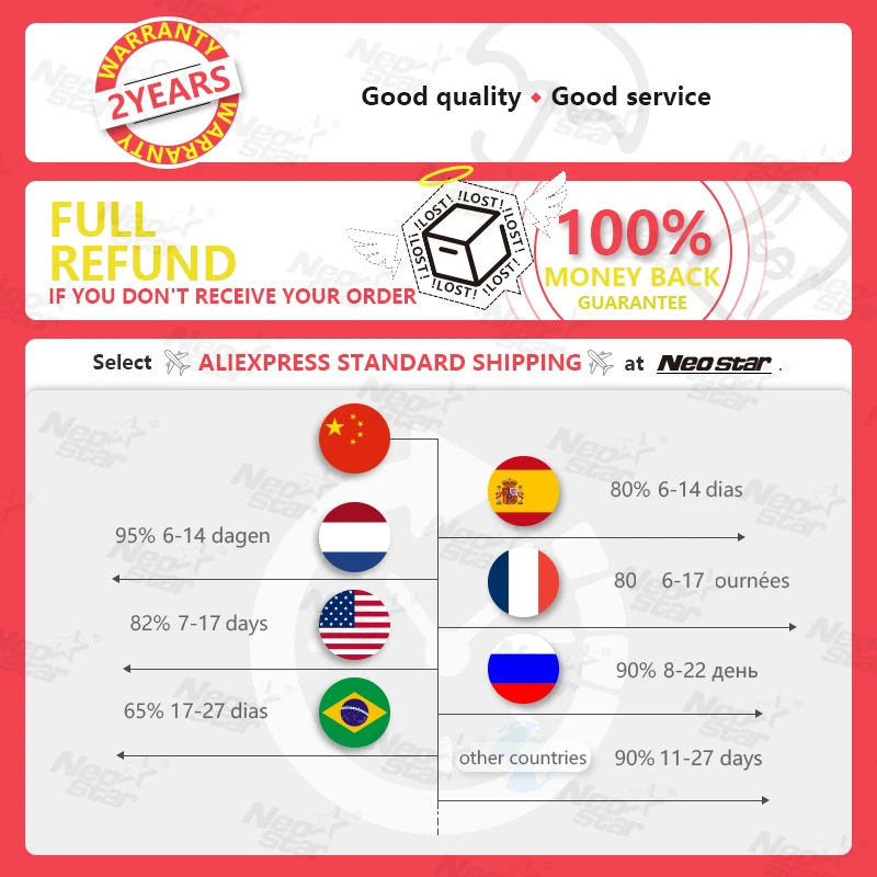 | 1) 8 months Manufacturer's limited Warranty for defective items (excluding items damaged and/or misused after receipt). Accessories come with a 3-month warranty. 2)Defective items MUST BE reported and returned within the warranty period (and in the original packaging, if possible). You must tell us what the defect is and give us your order number. WE DO NOT REPAIR OR REPLACE ITEMS WITH AN EXPIRED WARRANTY. You agree to all of the above-listed policies upon ordering on aliexpress! |
