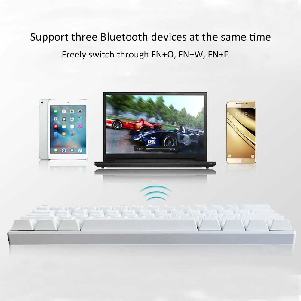 4, Support three Bluetooth devices at the same time, can control three Bluetooth devices at the same time, freely switch through FN+O, FN+W, FN+E.