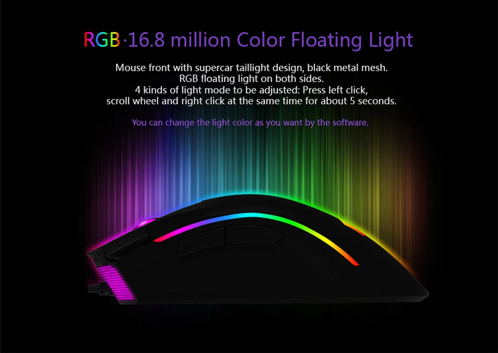 Light: 4 modes of colorful backlight (Press left/right/scroll wheel these three buttons together for 5 seconds to change it!)